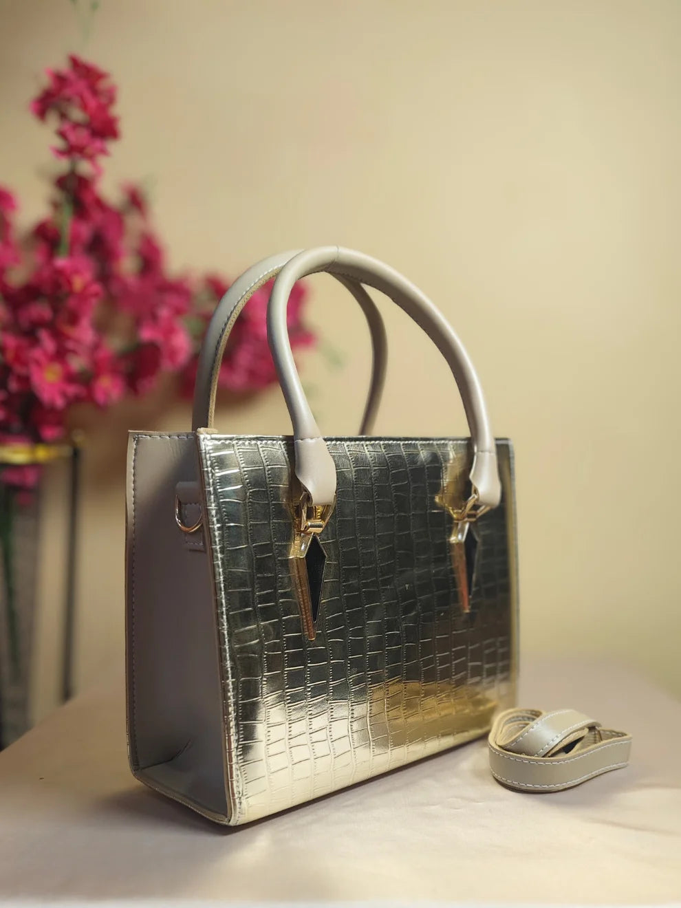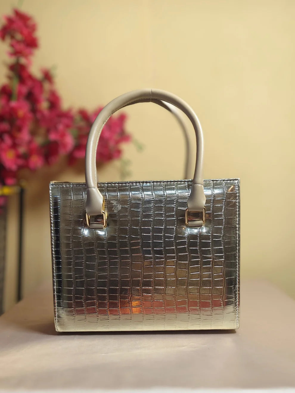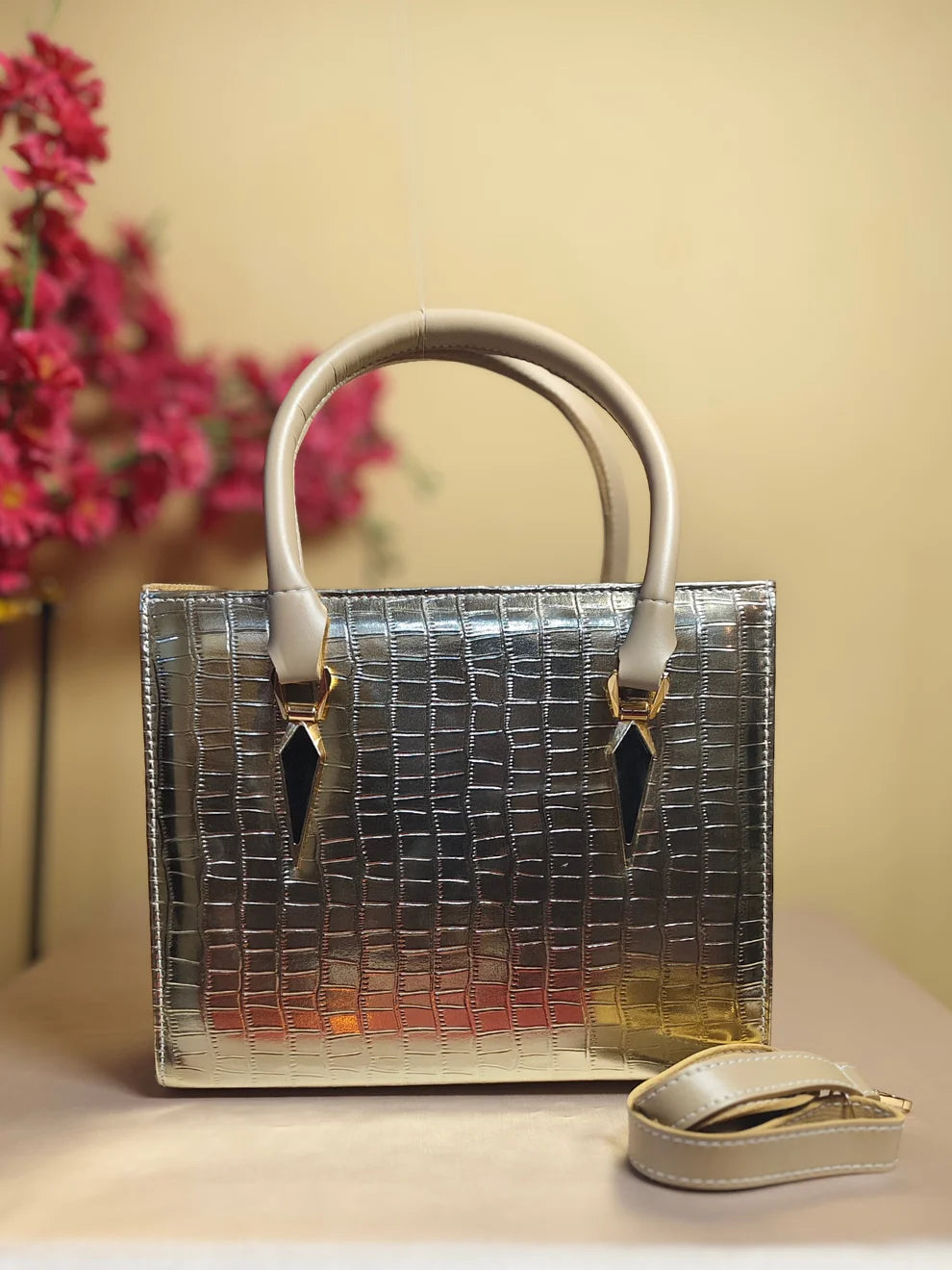 Turn head with this glamorous gold handbag crafted in a high shine crocodile texture. Designed for the bold and fashion forward, this bag offers a structured silhouette and includes a detachable strap for versatility. Ideal for parties, evening events, or when you just want to shine.