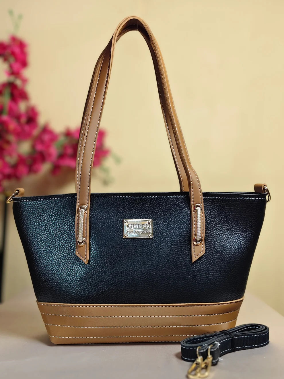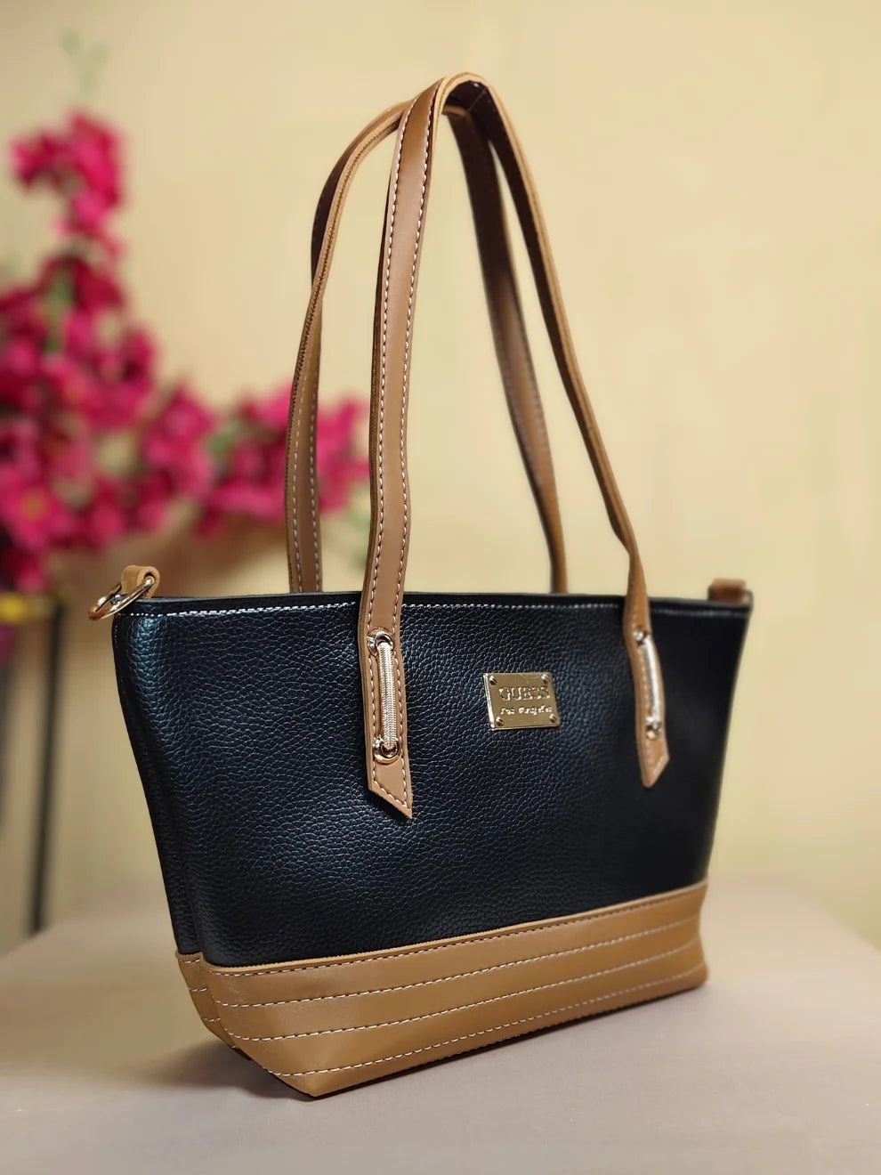 - Elegant Two-Tone Design, Classic black upper with a warm tan base and handles, perfect for both casual and formal looks.