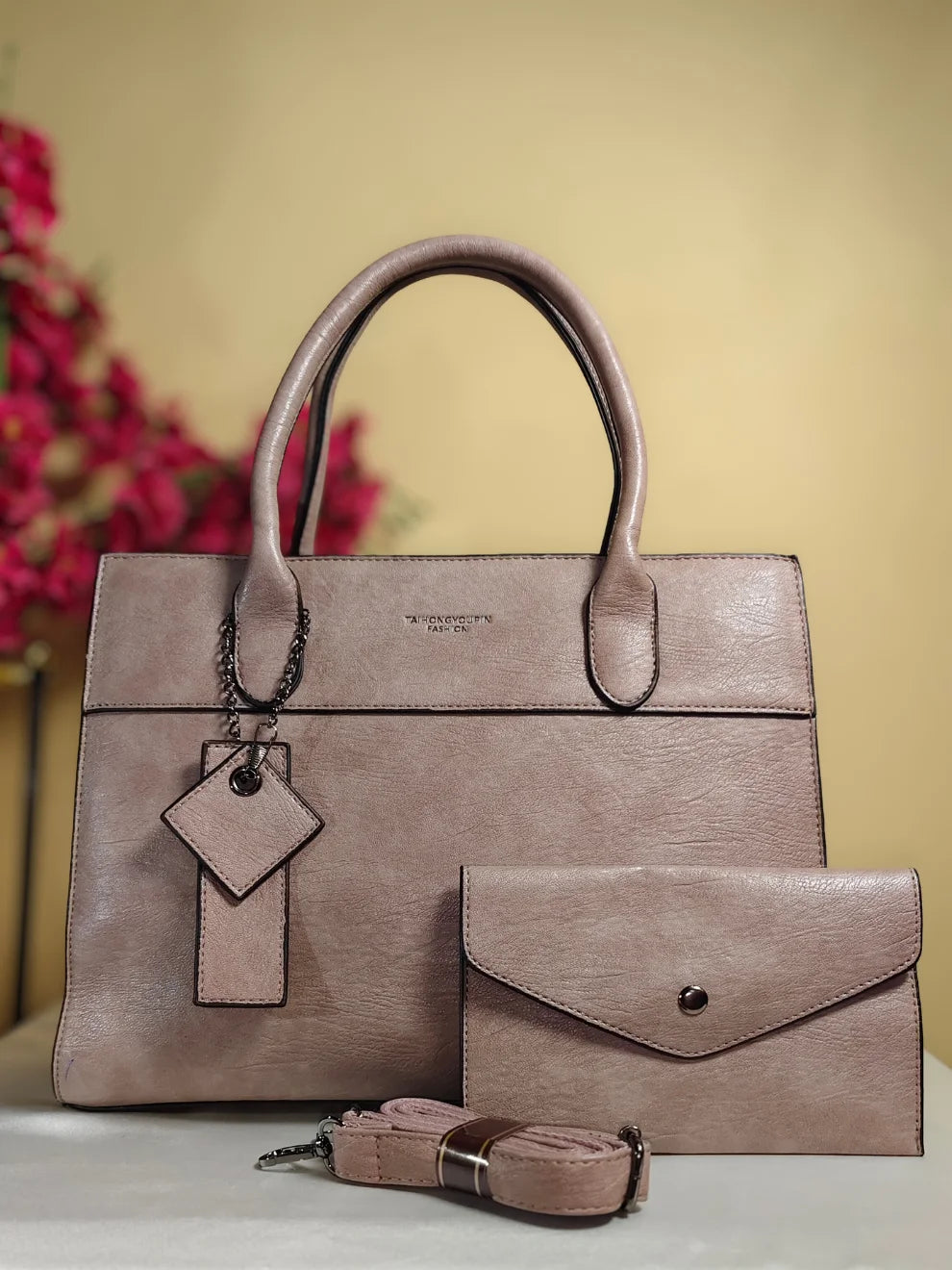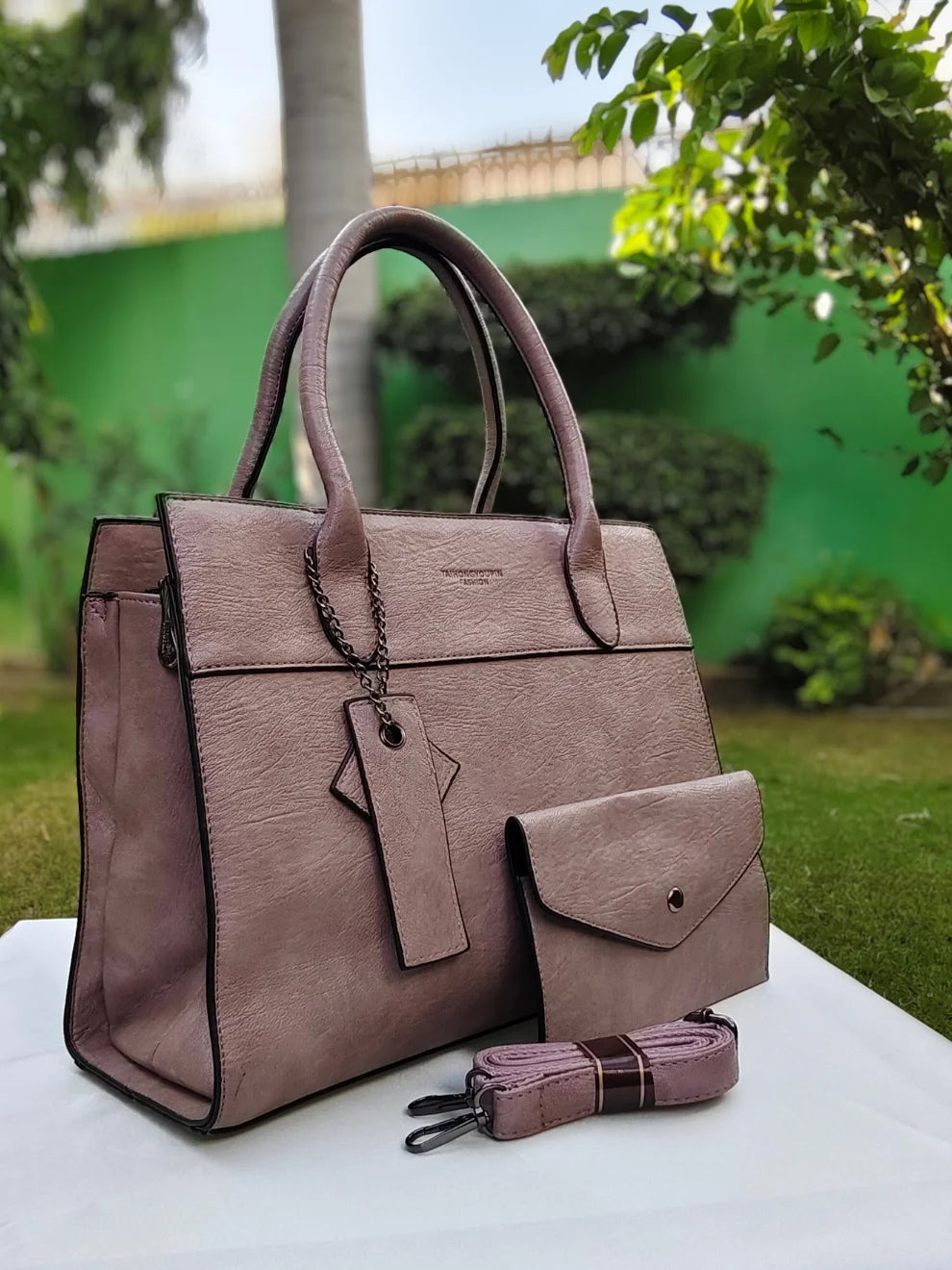 - A 3-piece Imported Designer set - Includes a structured handbag, matching wallet, and adjustable strap.