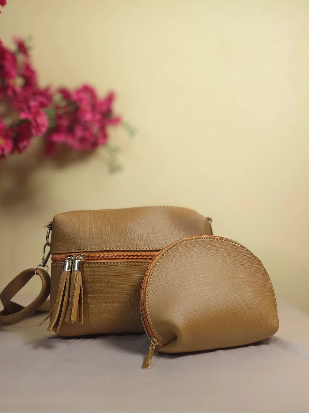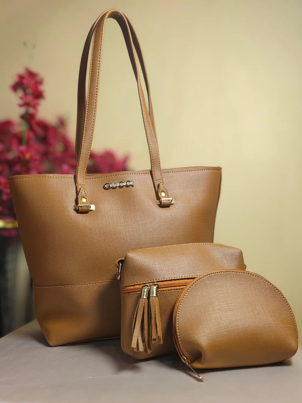Stay stylish and organized with this versatile 3-in-1 Tan Tote Bag set . Thoughtfully designed for fashion and functionality. Crafted from high quality faux leather. This set include,